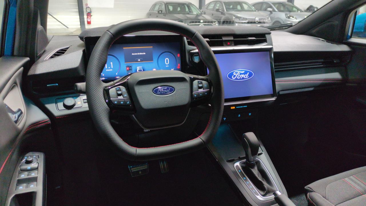 ABS,Air conditionné automatique,Airbags frontaux et latéraux conducteur et passager AV,Airbags rideaux AV,Alerte de véhicule en approche,Allumage automatique des phares,Arches de roue couleur carrosserie,Assistance à la conduite économique,Assistant de maintien dans la voie,Assistant de pré collision avec freinage post collision,Avertisseur de conduite à contre-sens,Badge ST-Line,Boîte automatique 7 vitesses,Caméra de recul,Capteur de pluie,Capteurs d'aide au stationnement AR,Ciel de toit avec pare-soleil éclairés,Combiné d'instrumentalisation numérique 12.8",Console centrale avec accoudoir coulissant,Contrôle de la traction (TCS),Direction assistée,Feux AR à LED,Frein à tambour AR,Freins à disques AV,Grille de calandre Active,Jantes alliage 17" ST-Line,Jupes latérales couleur carrosserie,Kit carrosserie ST-Line (bouclier AV sport et diffuseur AR),Lecture des panneaux de signalisation,Megabox (compartiment de rangement sous le plancher du coffre),Modem 5G,Pare-brise acoustique,Peinture métallisée Fashion Bleu Aqua,Planche de bord en vinyle Premium,Plaques de seuil de portes en aluminium avec logo,Pommeau de levier de vitesse en Sensico,Pommeau de levier de vitesse gainé cuir avec surpiqures rouges,Projecteurs LED avec feux de jour et commutateur de feux de route automatique,Pédalier Aluminium,Régulateur/limiteur de vitesse,Rétroviseur intérieur électrochrome,Rétroviseurs extérieurs couleur carrosserie,Rétroviseurs extérieurs électriques, chauffants avec répétiteur de clignotant et coque couleur carrosserie,Roue de secours galette,Siège Sport,Siège conducteur à réglage manuel 2 positions,Siège conducteur à réglage manuel 4 positions,Sièges AV en tissu avec surpiqûres rouges,Suspension Sport,Système d'infodivertissement SYNC4 avec écran tactile 12" et commandes vocales, 2 ports USB, navigation, Apple CarPlay et Android auto, 6 HP,Système de contrôle de la trajectoire et de la stabilité avec assistant au freinage d'urgence et aide au démarrage en côte,Système de surveillance de la pression des pneus,Sélecteur de mode de conduite,Vitres AR surteintées,Vitres électriques AV et AR,Volant en cuir Sensico perforé,