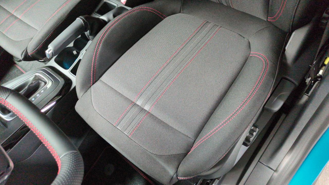 ABS,Air conditionné automatique,Airbags frontaux et latéraux conducteur et passager AV,Airbags rideaux AV,Alerte de véhicule en approche,Allumage automatique des phares,Arches de roue couleur carrosserie,Assistance à la conduite économique,Assistant de maintien dans la voie,Assistant de pré collision avec freinage post collision,Avertisseur de conduite à contre-sens,Badge ST-Line,Boîte automatique 7 vitesses,Caméra de recul,Capteur de pluie,Capteurs d'aide au stationnement AR,Ciel de toit avec pare-soleil éclairés,Combiné d'instrumentalisation numérique 12.8",Console centrale avec accoudoir coulissant,Contrôle de la traction (TCS),Direction assistée,Feux AR à LED,Frein à tambour AR,Freins à disques AV,Grille de calandre Active,Jantes alliage 17" ST-Line,Jupes latérales couleur carrosserie,Kit carrosserie ST-Line (bouclier AV sport et diffuseur AR),Lecture des panneaux de signalisation,Megabox (compartiment de rangement sous le plancher du coffre),Modem 5G,Pare-brise acoustique,Peinture métallisée Fashion Bleu Aqua,Planche de bord en vinyle Premium,Plaques de seuil de portes en aluminium avec logo,Pommeau de levier de vitesse en Sensico,Pommeau de levier de vitesse gainé cuir avec surpiqures rouges,Projecteurs LED avec feux de jour et commutateur de feux de route automatique,Pédalier Aluminium,Régulateur/limiteur de vitesse,Rétroviseur intérieur électrochrome,Rétroviseurs extérieurs couleur carrosserie,Rétroviseurs extérieurs électriques, chauffants avec répétiteur de clignotant et coque couleur carrosserie,Roue de secours galette,Siège Sport,Siège conducteur à réglage manuel 2 positions,Siège conducteur à réglage manuel 4 positions,Sièges AV en tissu avec surpiqûres rouges,Suspension Sport,Système d'infodivertissement SYNC4 avec écran tactile 12" et commandes vocales, 2 ports USB, navigation, Apple CarPlay et Android auto, 6 HP,Système de contrôle de la trajectoire et de la stabilité avec assistant au freinage d'urgence et aide au démarrage en côte,Système de surveillance de la pression des pneus,Sélecteur de mode de conduite,Vitres AR surteintées,Vitres électriques AV et AR,Volant en cuir Sensico perforé,